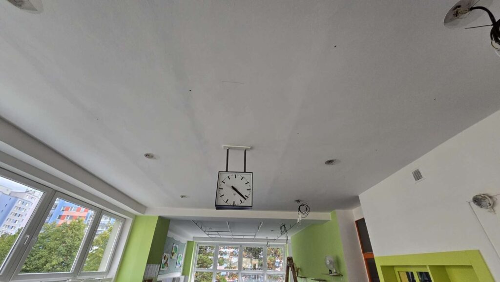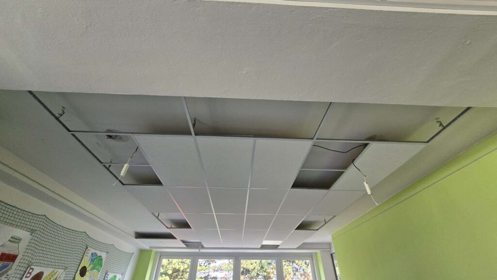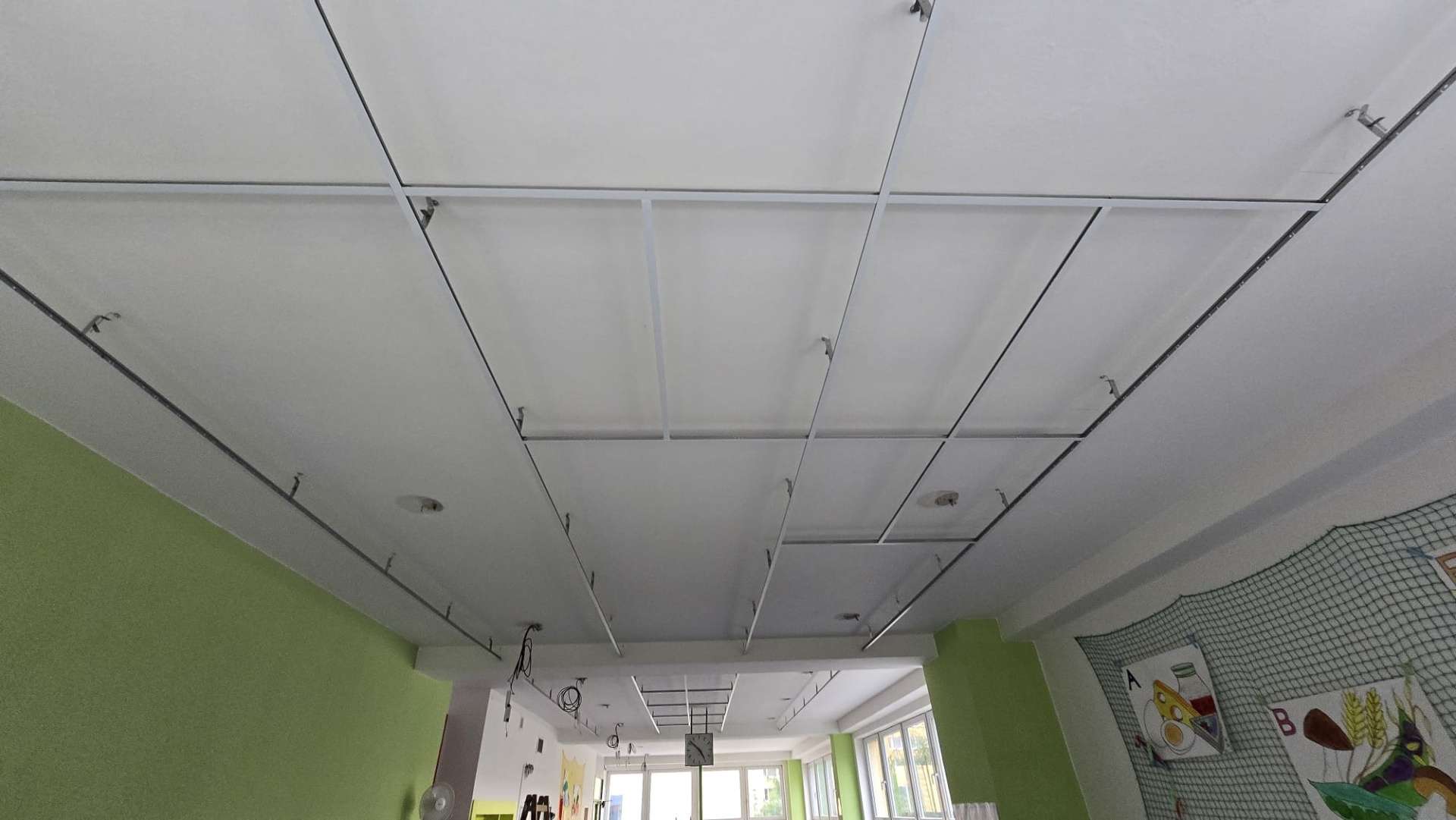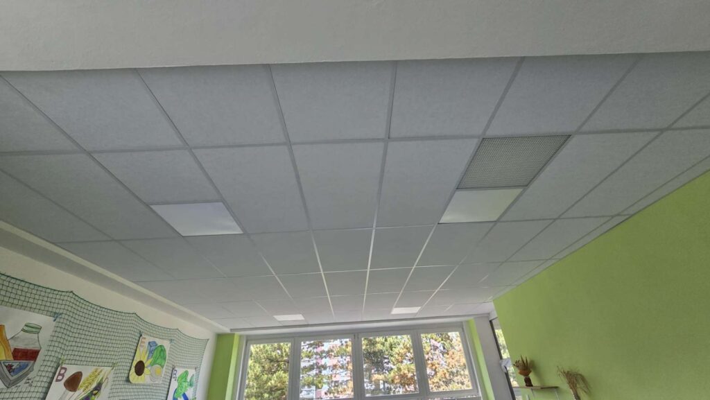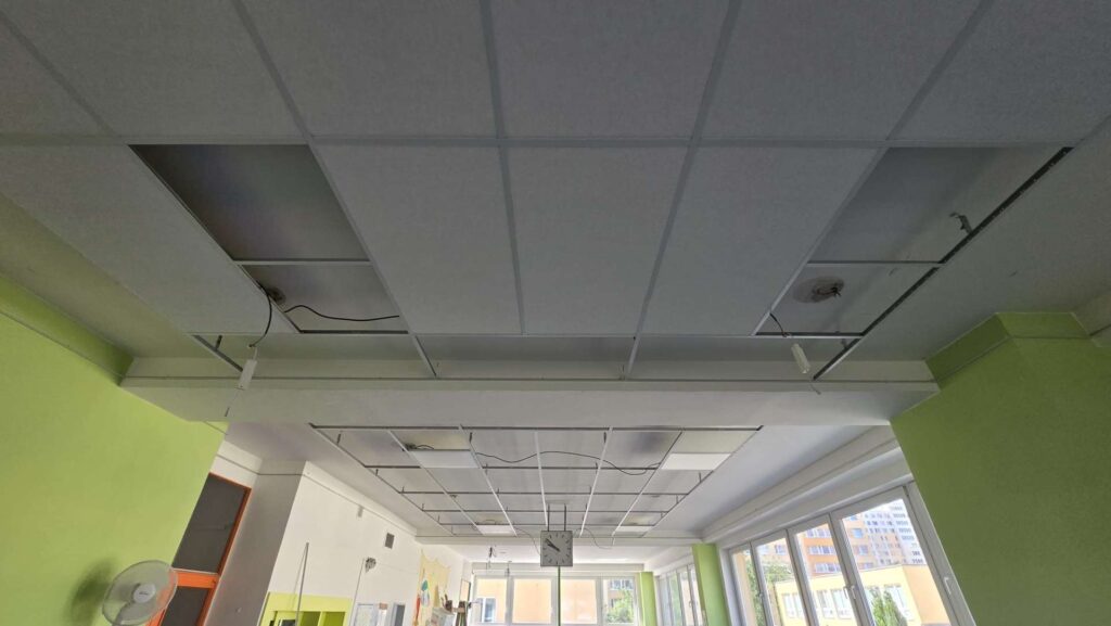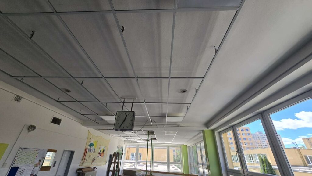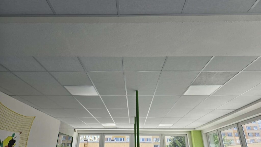 Pro eliminaci problémů s odrazivostí zvuků byl navržen komplexní systém akustických úprav zaměřený na stropní plochy. Řešení bylo koordinováno s instalací nových LED světelných panelů do podhledu.