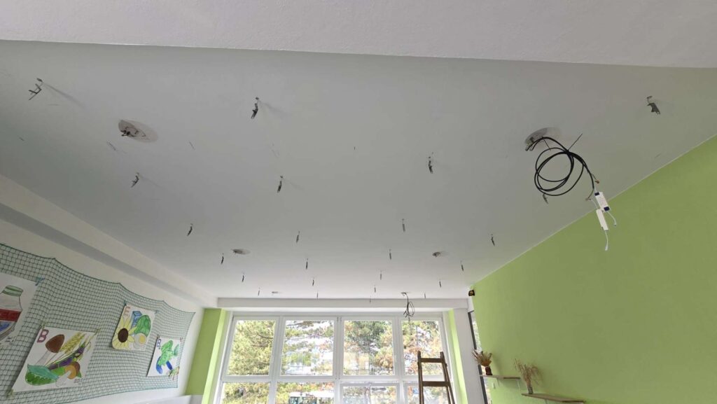 Místnost před jídelnou vykazovala typické problémy tvrdých povrchů bez akustického ošetření. Hladké stěny a strop způsobovaly vysokou odrazivost zvuků, která amplifikovala každý zvuk a vytvářela nepříjemné akustické podmínky.