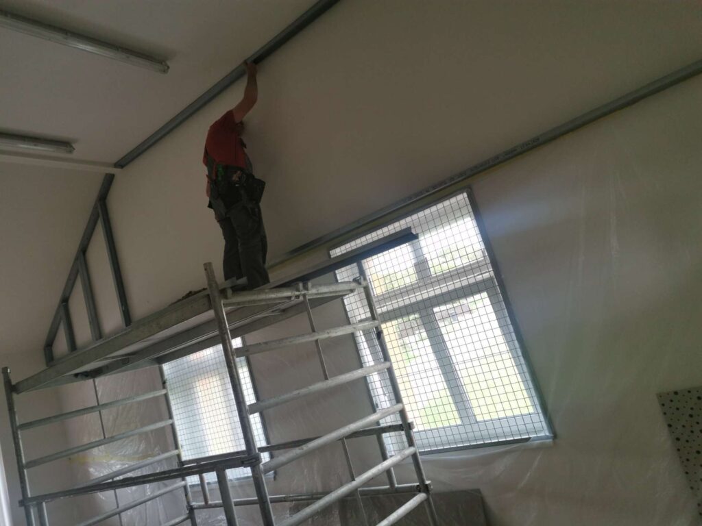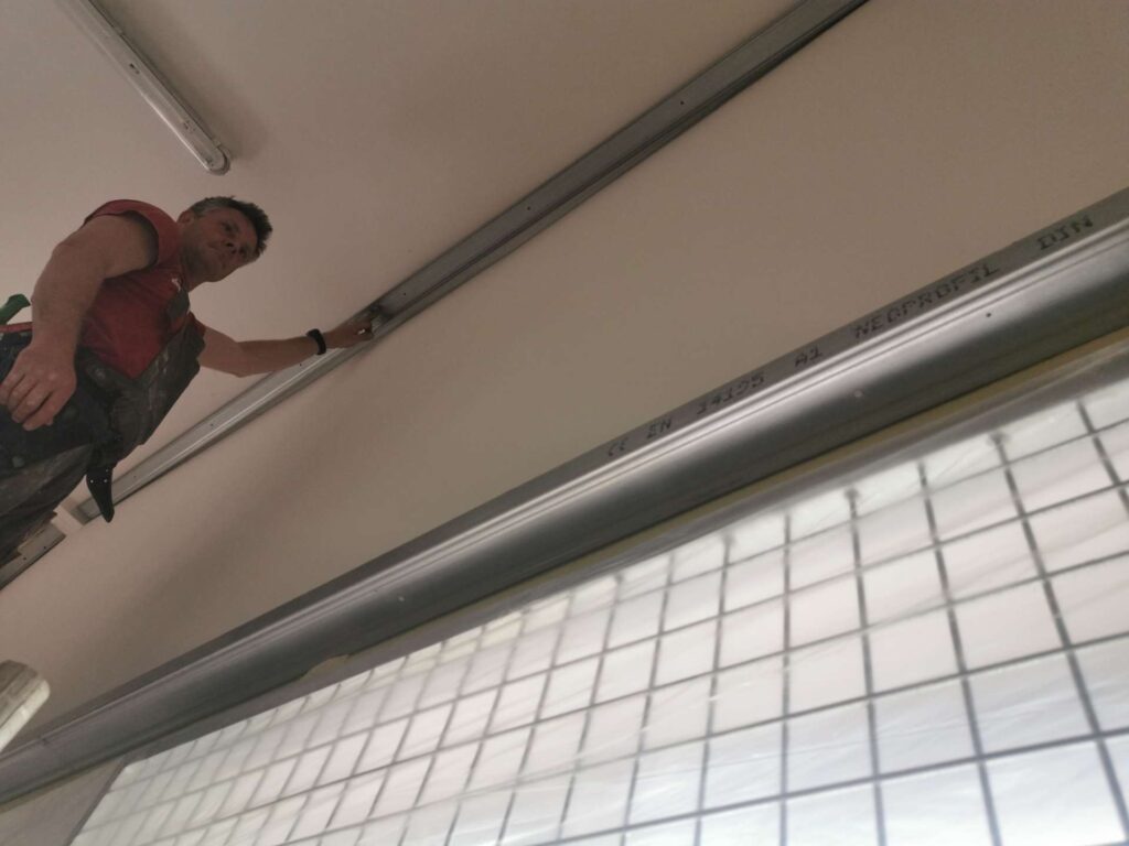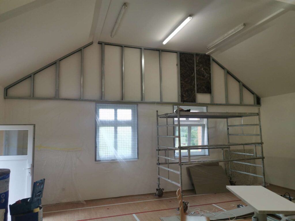 Prostorová dispozice tělocvičny vyžadovala nestandardní přístup. Sedlová střecha se šikminami a omezená výška vylučovaly použití tradičních řešení.