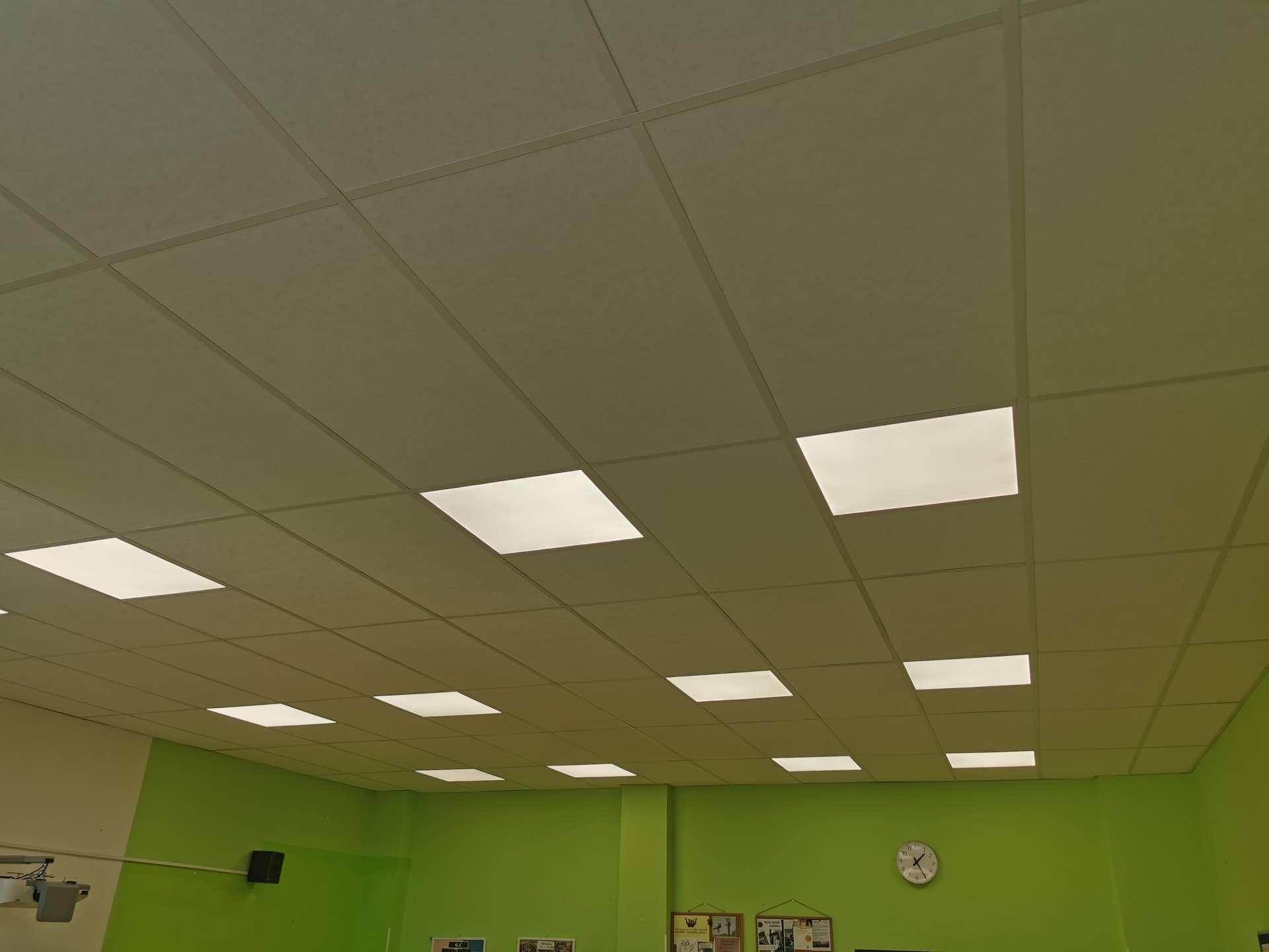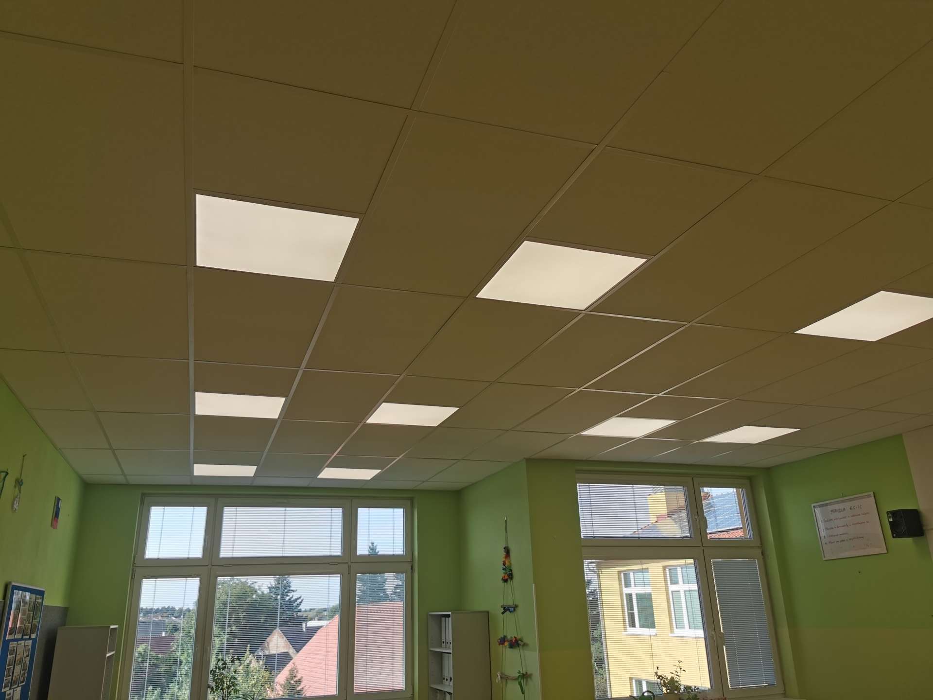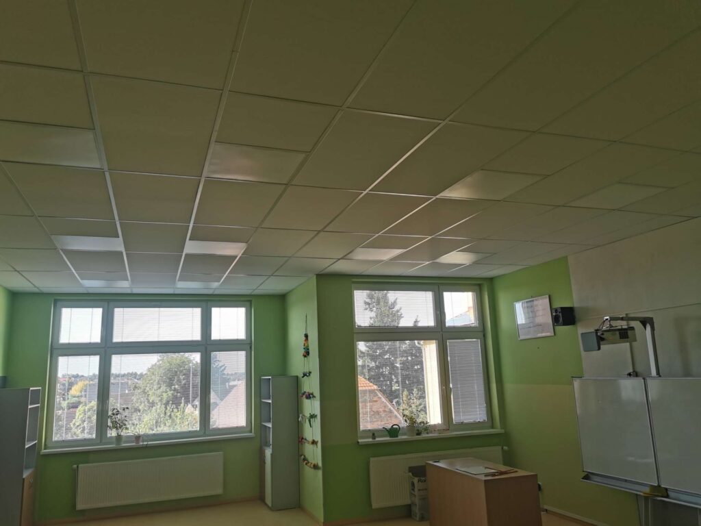 Pro rychlou a efektivní transformaci sborovny na plnohodnotnou učebnu bylo navrženo kompaktní řešení kombinující akustický podhled s moderním osvětlením.